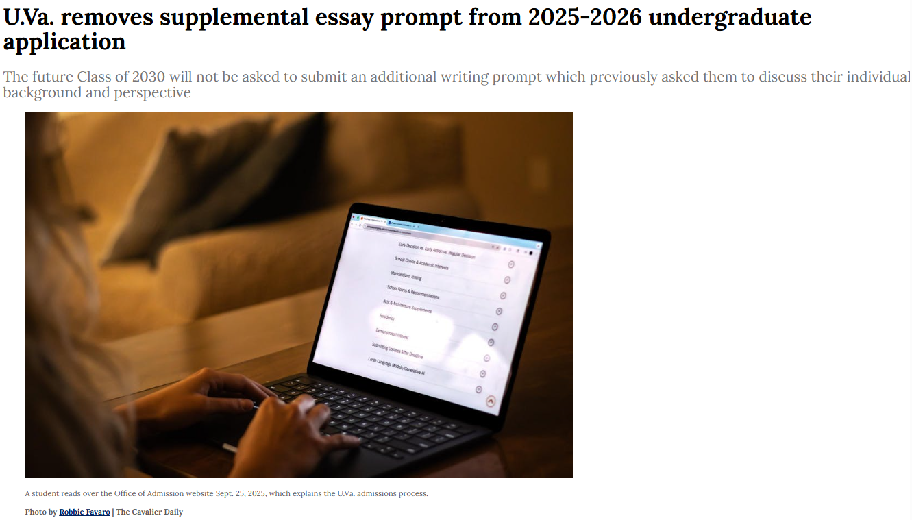 2025-2026申请周期,弗吉尼亚大学也取消了多元化申请文书题目。校方称取消该题目旨在减轻申请负担,缓解围绕大学申请流程产生的压力和焦虑。