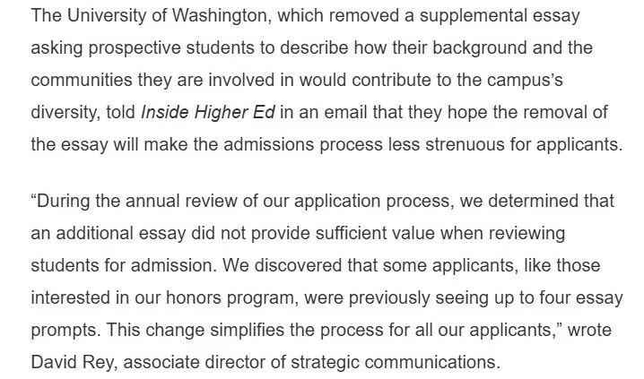 华盛顿大学取消了一篇补充文书,该文书要求申请者描述个人背景与社区经历如何为校园的多样性做出贡献。