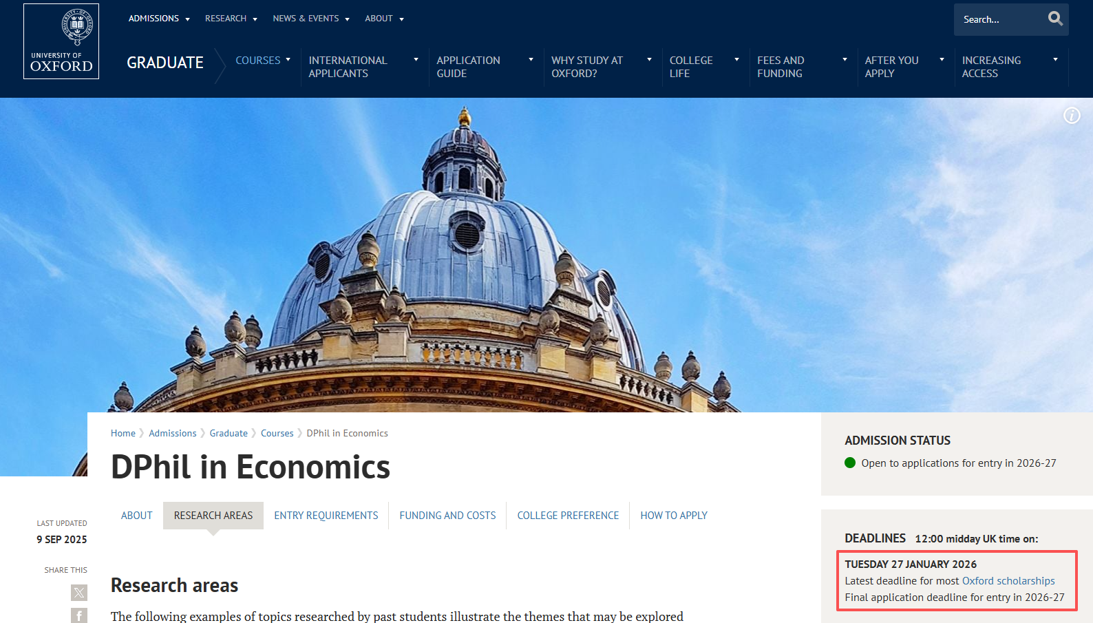 注意!牛津大学2026-2027年经济学博士(DPhil in Economics)已开放申请,将于2026年1月27日截止!