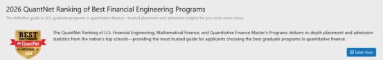 最近,美国金工/金数圈专业排名扛把子:QuantNet,正式发布了2026金融工程排名!