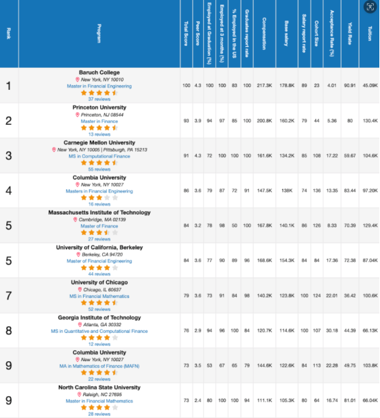 【1】巴鲁克学院金融工程硕士强势回归榜首!
