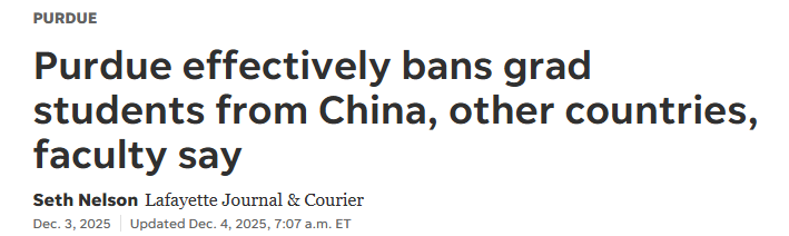 普渡的教务长甚至在回信中同意“中国确实带来风险”的说法。到了6月,学校更是出台政策,禁止教授们与中国等“foreign adversary countries”建立财务和招聘联系——虽然没有直接说不招中国等国家的学生,但这氛围已经很明显了。