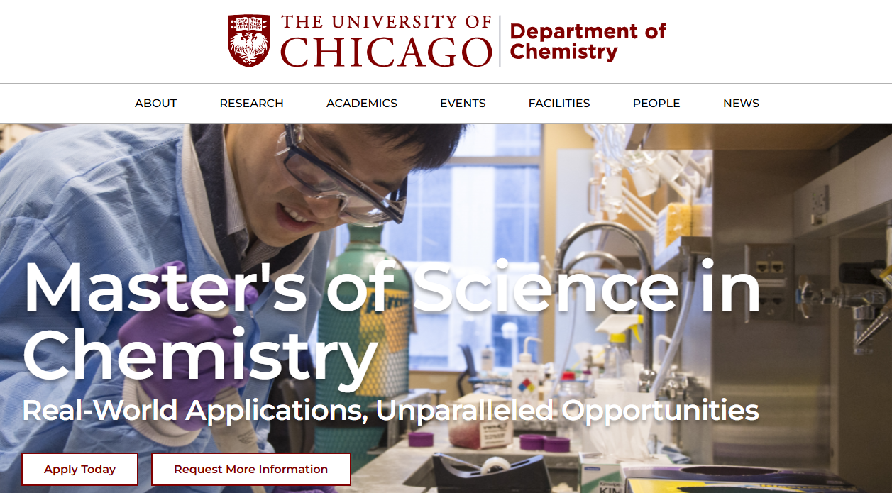 如果你正在考虑去美国留学读研,尤其对化学、材料、生物科技或能源领域感兴趣,那最近有个消息可能让你眼前一亮——芝加哥大学化学系正式推出了全新的化学理学硕士项目(Master’s of Science in Chemistry),2026年秋季将迎来首届学生,目前申请通道已开启,将于2026年5月15日截止,感兴趣的同学可以关注一下。