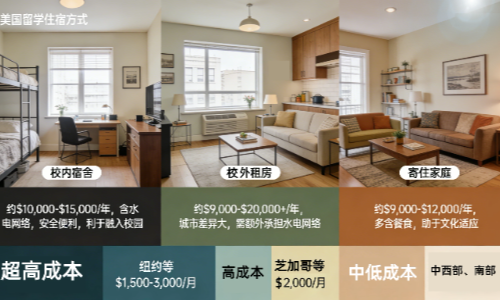 美国留学住宿方式主要分为三种,费用因类型与城市差距巨大: