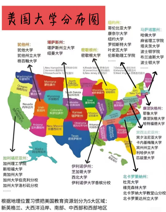 根据地理位置习惯,把美国教育资源分为5大区域:新英格兰,大西洋沿岸,南部地区,中西部地区,以及西部地区。