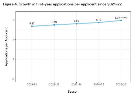 从申请策略来看,今年人均申请院校数量大概5.94所,比25fall的5.73所明显上涨,可见越来越多的学生更倾向于扩大申请范围,以此对冲录取的不确定性。
