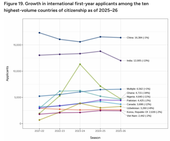 其中,中国学生申请量表现相对稳定,26fall申请人数16384人,同比下降1%,相对比于非洲申请学生14%的降幅来说,还好,依旧是美国本科申请人数中最多的国际生来源国。
