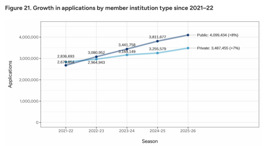 就Common App数据来看,公立大学申请量同比增长8%,私立大学申请量同比增长7%,其中录取率高于25%的院校增长尤为明显。