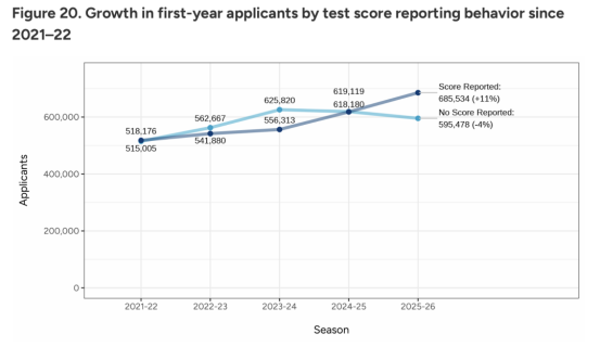 就相关数据显示,26fall提交标化成绩的申请学生为685534人,同比增长11%,没有提交标化成绩的申请学生为595478人,同比下降4%。