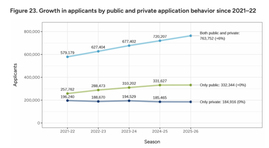 再有,同时申请了公立大学和私立大学的学生人数,同比增长6%。