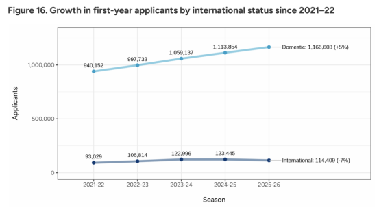 从申请学生的构成来看,截止2026年1月1日,美国本土申请学生1166603人,同比增长5%,国际学生114409人,同比下降7%。