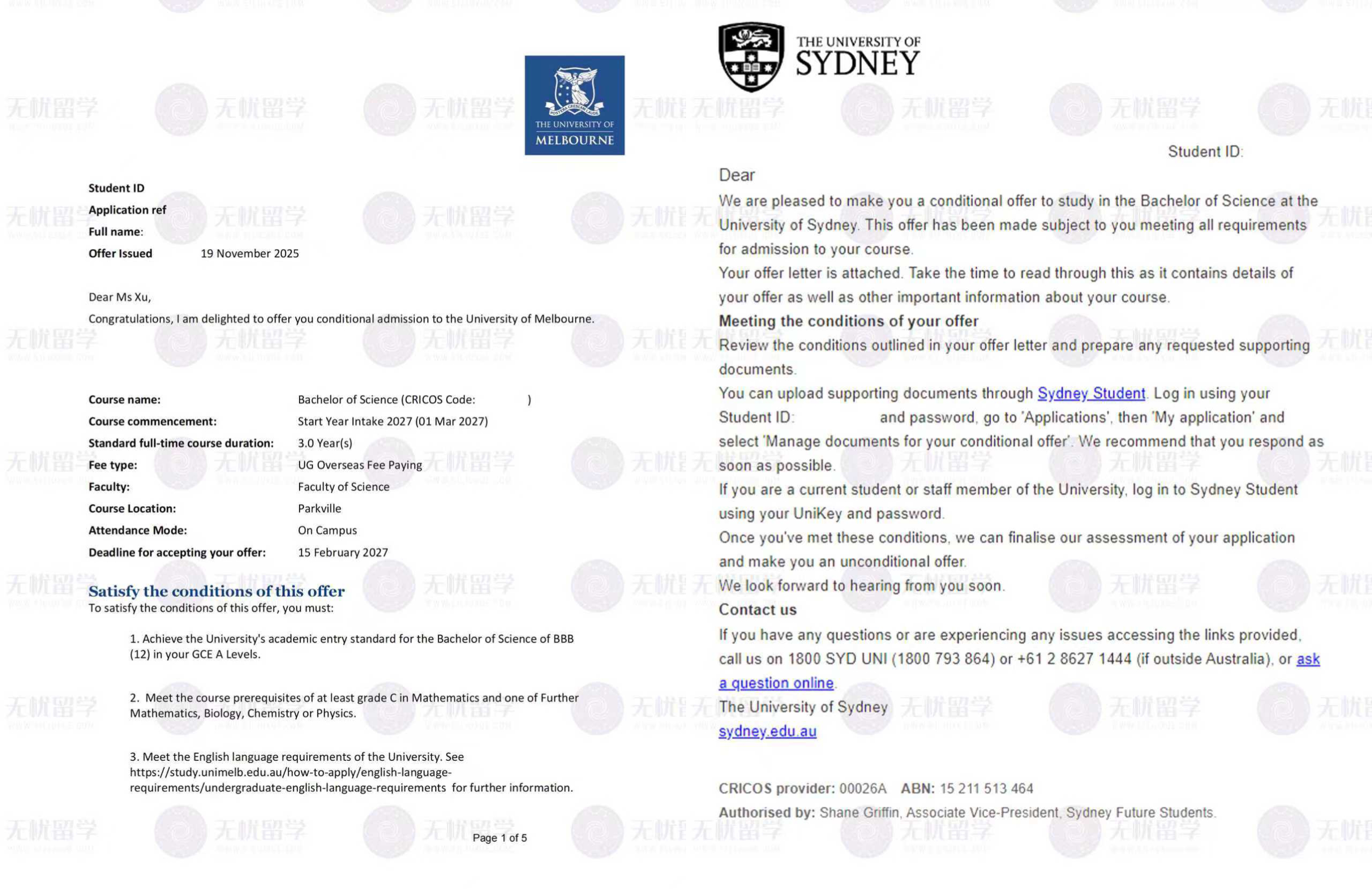 无忧留学深耕澳洲留学申请多年,凭借对八大院校申请标准的精准把控、定制化的服务体系,许同学的成功案例就是最好的证明。许同学A-Level预估分为数学A*、经济A*、高数A,结合其学术优势与申请诉求,无忧留学为其定制了专属申请方案,精准匹配悉尼大学、墨尔本大学的数据科学方向,全程提供院校定位、文书优化、材料审核、申请跟进等一站式服务,规避申请风险、突出个人优势,最终帮助许同学成功斩获悉尼大学Bachelor of Science(Data Science Pathway)、墨尔本大学Bachelor of Science(Data Science Pathway)两封重磅offer。