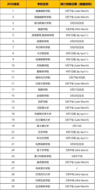 ⏩ 美国文理学院Top30放榜日期汇总