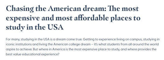 据悉,该榜单排名指标直接跟“钱”挂钩,包括城市生活成本,学校平均学费,平均月租金,交通费,伙食费等等,非常全面,美国留学预算党码住!