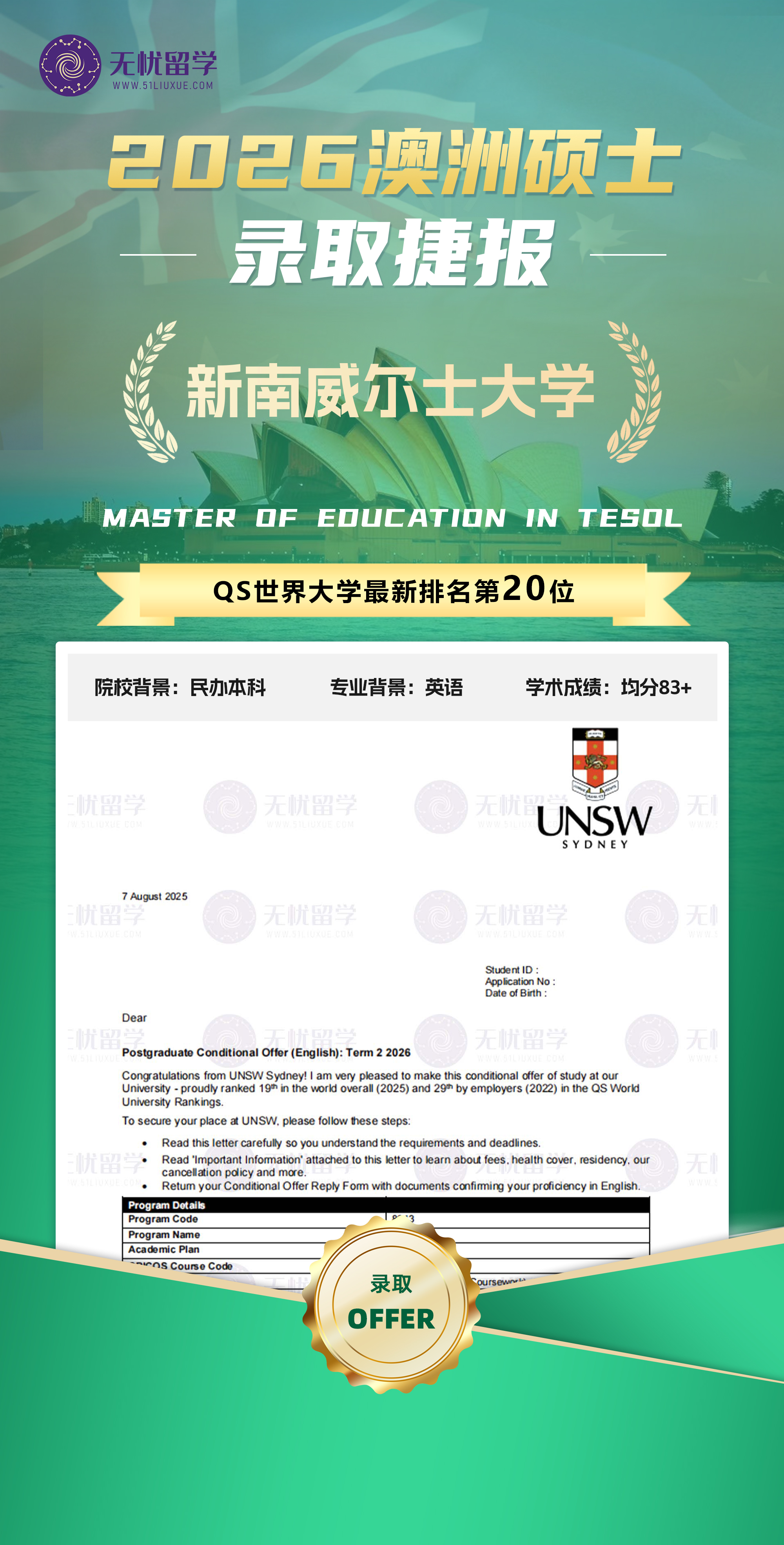 考研失利不是终点,而是海外深造的新起点,无忧留学深耕英澳硕士申请十余年,专为26fall考研后学子打造极速申请、精准匹配、全程托管服务体系,助力每一位学子高效逆袭世界名校。我们深谙考研后申请的时间紧迫性与需求特殊性,1v1定制升学方案:针对双非、低均分、跨专业等不同背景,精准匹配冲刺、稳妥、保底院校,确保每一位学生都能拿到最优录取;极速材料指导:72小时完成文书撰写、材料整理、网申递交,无缝衔接院校截止时间,不错过任何申请窗口期;语言与签证全支持:无雅思可先申,提供雅思/托福备考指导、语言班申请,签证办理全程陪同,确保顺利获签、按时入学;后续服务全覆盖:入学前住宿、接机安排,入学后学业指导、工签移民咨询,从申请到毕业一站式护航。无忧留学26fall英澳硕士申请录取率超95%,已帮助数百位考研后学子斩获UCL、曼大、墨大、悉尼大学等世界百强offer。无论你是本科背景普通,还是时间仓促准备不足,我们都能凭借丰富的案例经验、独家院校合作资源,为你打通考研后升学的最后一公里。