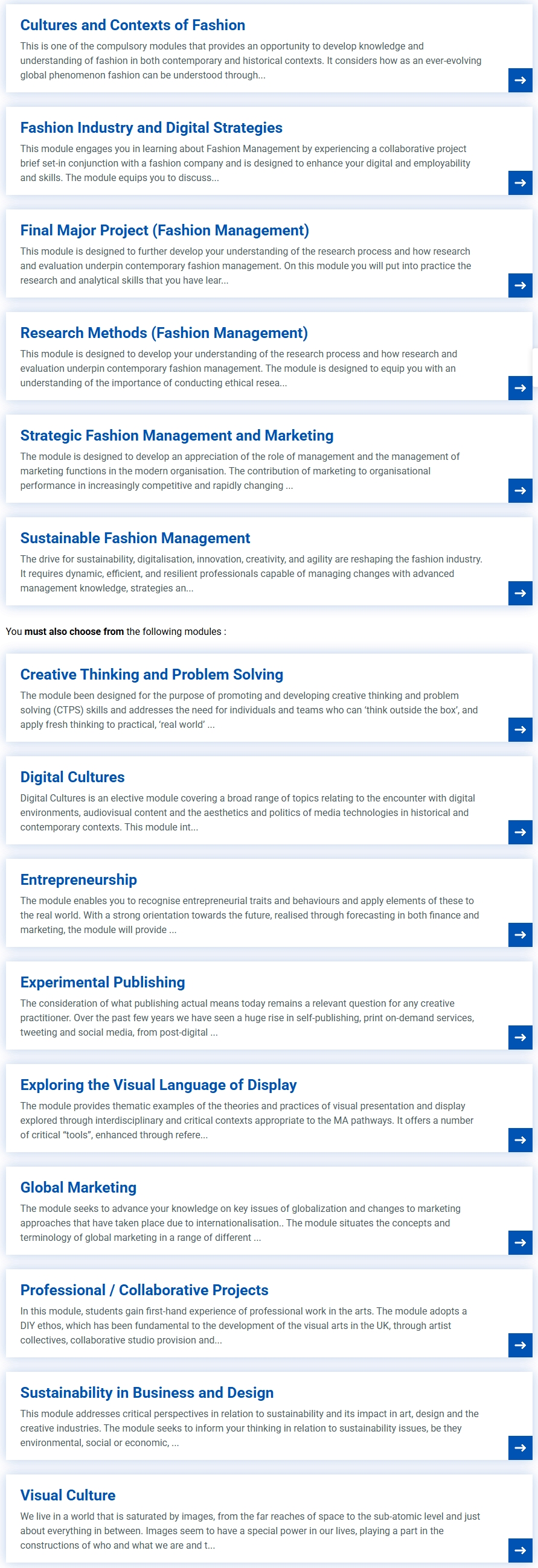 该时尚管理文学硕士(MA Fashion Management)学位课程旨在助力你成长为一位成功、坚韧且富有责任心的时尚行业领军者。你将能够从容应对、妥善管理并积极回应瞬息万变的时尚行业所带来的挑战与机遇。