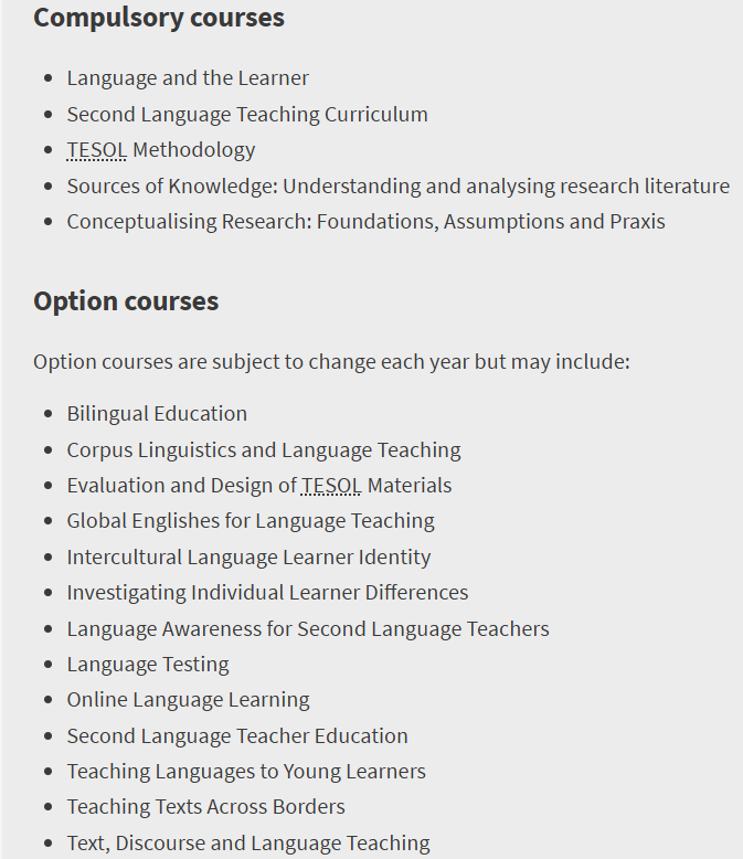 该硕士学位课程既适合经验丰富的教师,也适合该领域的新手,专为计划在英国或国际上从事英语作为第二语言、外语或附加语言(ESL、EFL、EAL)教学的学生而设计。同时,该课程也适合计划在以下领域工作或进行研究的学生:教师教育、教师培训、管理、课程设计、教材开发、政策设计、语言分析与/或评估。