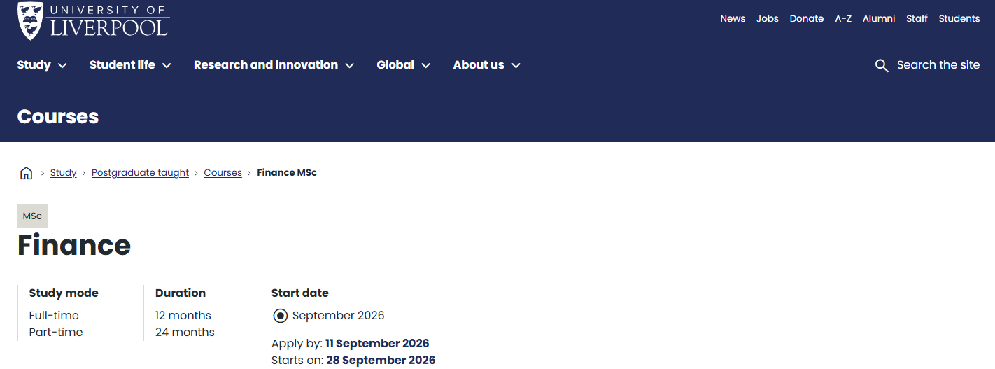 申请要求:英国2:2荣誉学位,本科专业应为金融、会计或经济学。对于修读其他专业但课程中包含大量金融学内容的优秀申请者,也会予以考虑。