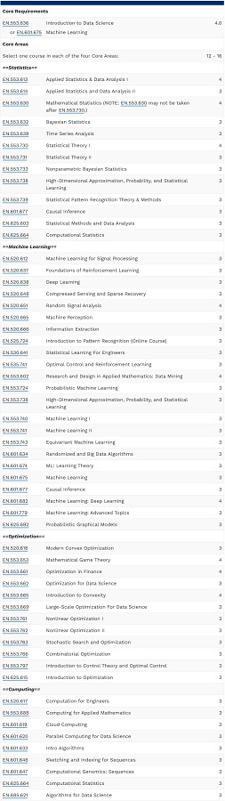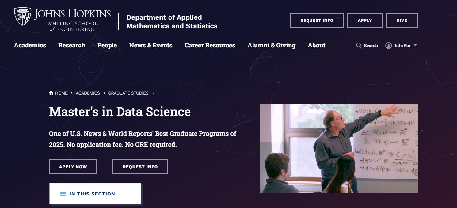 约翰霍普金斯大学的数据科学硕士项目为全寄宿制项目,该项目将提供应用数学、统计学和计算机科学方面的培训,为理解和鉴赏现有的数据科学工具奠定基础。我们的项目旨在培养下一代数据科学领域的领军人物,强调掌握将现实世界中数据驱动的问题转化为数学问题所需的技能,并运用多样化的科学工具来解决这些问题。