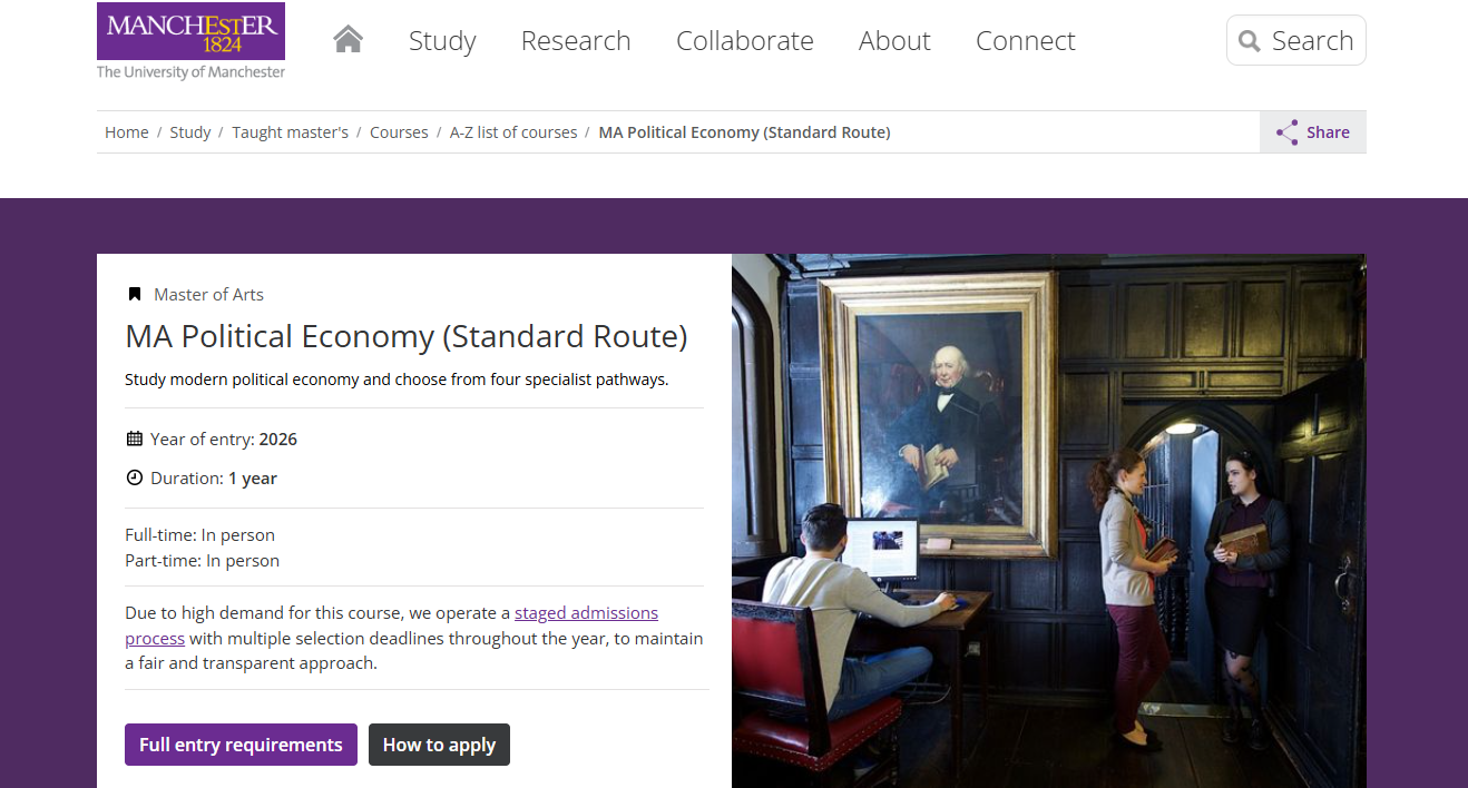 曼大我们的王牌项目——政治经济学文学硕士课程,开设于曼彻斯特大学久负盛名的政治经济学研究中心。该中心汇聚了人文学院世界一流的研究力量与教学资源,开设了一门严谨务实、影响深远且高度跨学科的课程,旨在深入剖析国家与全球经济、政治格局以及公共政策之间的复杂关系。