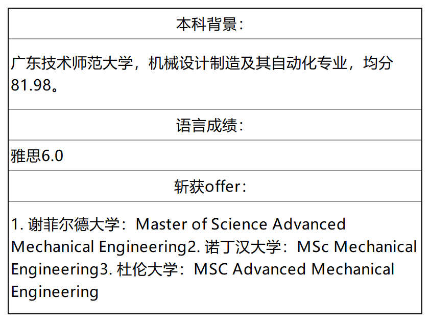 李同学的申请起点并非亮眼,均分和雅思仅达部分院校最低要求,与985/211院校申请者相比,硬件条件不占优势。但无忧留学英国申请团队在初步评估时发现,李同学的核心竞争力在于专业基础扎实,本科阶段修读了固体力学、热力学、流体力学等机械工程核心课程,且成绩优异,与目标院校的课程要求高度契合,这成为逆袭的关键突破口。