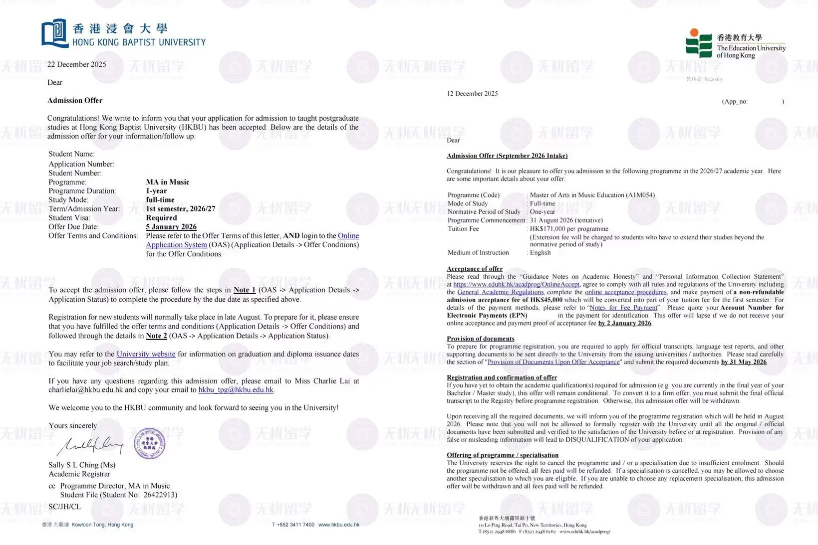 本次录取的学生虽具备扎实的音乐师范专业基础,但院校背景为双非,在香港硕士申请内卷日趋激烈、音乐类专业竞争愈发白热化的当下,想要同时斩获两所顶尖港校offer,难度不容小觑。针对学生的背景特点与申请需求,无忧留学依托核心服务优势,为其配备专属双师服务小组,量身打造定制化申请方案,全程精细化护航,助力学生成功突破背景局限,实现双校录取。