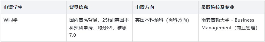 于国内普高背景的学生而言,想要跻身英国顶尖大学本科行列,预科阶段是衔接中英教育体系、实现弯道超车的关键跳板。无忧留学凭借专业的全流程服务、精准的申请定位的个性化方案,成功助力国内普高背景的W同学,以均分89分、雅思7.0的成绩,顺利斩获南安普顿大学Business Management本科预科offer,为其开启英伦商科深造之路保驾护航。作为英国罗素集团成员、QS世界百强名校,南安普顿大学的商科专业一直备受国际学生青睐,其本科预科课程专为国际学生设计,旨在帮助学生弥补中英教育差异,在学术能力、语言应用和学习思维上实现全方位提升,顺利衔接本科学位课程。