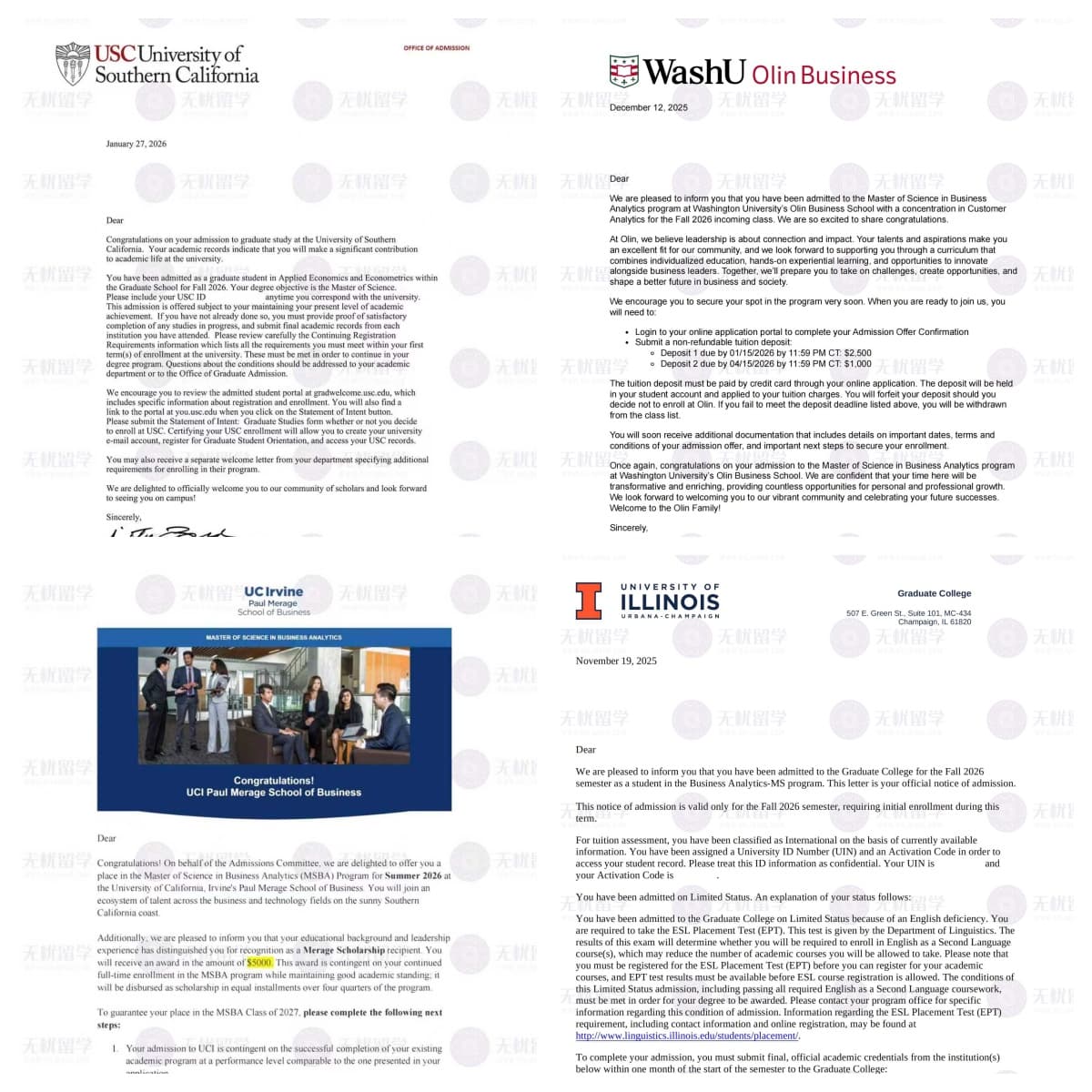 无忧留学专注美国商科、数据科学、商业分析、经济学、统计学硕士申请,尤其擅长中央财经、对外经贸、上财等财经类院校背景提升与名校冲刺,凭借多年录取数据、精细化文书打磨、全流程申请把控,已帮助无数同学拿下 WUSTL、USC、UIUC、UCI、JHU、NYU 等美国顶尖名校录取。