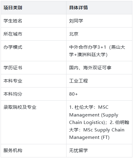随着中外合作办学模式的普及,3+1项目凭借“国内夯实基础+海外拓展视野”的独特优势,成为越来越多学生通往世界名校的重要路径。但这类学生在申请英国硕士时,往往面临着背景定位模糊、文书撰写难、院校偏好难把握等痛点。来自燕山大学工业工程专业、均分80+的刘同学,在申请陷入困境之际,选择无忧留学全程护航,最终成功斩获杜伦大学MSC Management (Supply Chain Logistics)、伯明翰大学MSc Supply Chain Management (FT)两大顶尖院校offer,用实力诠释了“专业规划+精准服务”。