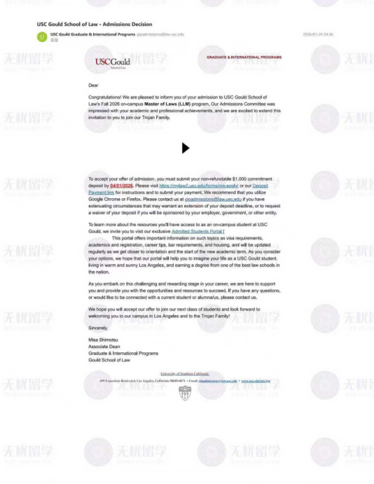 恭喜无忧留学学员W同学,来自北京化工大学法学专业,在竞争激烈的美国LLM【法学硕士】申请中强势突围,成功斩获南加州大学【USC,US News TOP28】LLM录取!