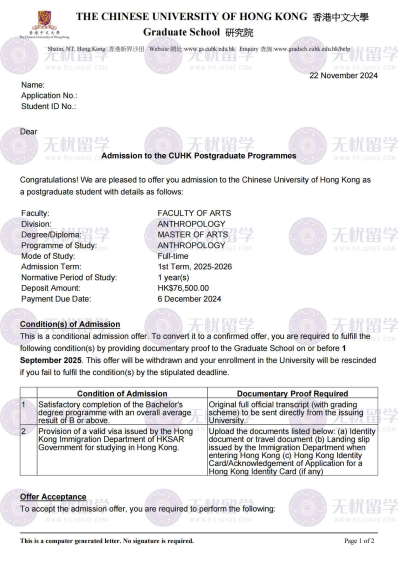 香港高校凭借顶尖的学术实力、国际化的教学氛围、灵活的学制设置,以及与大湾区产业的深度联动,成为北京学子深造的优选目的地。据2025香港硕士申请最新数据显示,北京地区申请港校硕士人数同比增长18%,顶尖院校热门专业录取率屡创新低,申请竞争持续白热化。作为深耕留学服务领域多年的专业品牌,无忧留学始终聚焦北京学子香港院校申请核心需求,凭借对港校录取规则的精准洞察、定制化的服务体系及资深的本地服务团队,帮助北京无数学子突破申请壁垒,圆梦理想院校。今日,无忧留学再传捷报,成功助力北京美本背景学子斩获香港中文大学人类学文学硕士offer,用实力印证品牌专业硬实力,为北京意向赴港深造的学子提供真实参考!