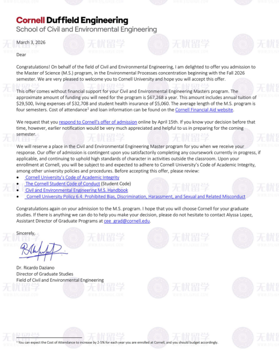 恭喜无忧留学学员Y同学,来自北京某211大学环境工程专业,凭借GPA3.31/4.0,托福101的成绩组合,在竞争激烈的美国工科硕士申请中强势突围,成功斩获康奈尔大学土木与环境工程硕士录取!