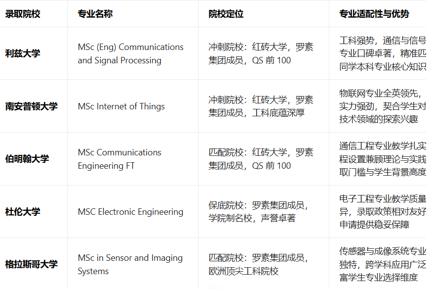 无忧留学为张同学配备了拥有5年以上英国工科申请经验的专属顾问,采用“三维评估体系”,对其进行全面剖析:一是学术背景评估,梳理其本科核心课程成绩、专业技能,明确其优势在于信息工程专业的系统性学习,短板则是均分未达到部分顶尖院校的核心要求;二是职业规划评估,结合张同学对通信、物联网领域的兴趣,明确其申请方向需贴合行业发展趋势,兼顾院校排名与专业实用性;三是院校匹配评估,依托无忧留学海量申请案例库,结合QS学科排名、院校录取偏好、城市消费水平等因素,为其筛选适配院校。顾问团队经过多轮筛选与论证,为张同学制定了科学的“冲刺-匹配-保底”选校方案:冲刺利兹大学、南安普顿大学;匹配伯明翰大学、格拉斯哥大学;保底杜伦大学。