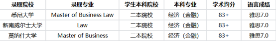 针对本次案例的学生背景,无忧留学资深顾问团队结合学生均分、本科专业、语言成绩及留学诉求,制定了科学稳妥的定制化选校策略。学生为二本院校经济金融专业,均分83+,雅思7.0,目标冲刺澳洲八大名校,兼顾法学与商科类专业,想要实现名校逆袭。团队依托多年澳洲申请经验,结合澳洲八大对二本院校学生的录取偏好,精准避开竞争过于激烈的饱和热门专业,挑选适配学生背景、录取率更高、就业前景好的专业,同时合理搭配高排名冲刺校、稳妥匹配校和保底院校,全程把控文书质量、材料递交时效,最终帮助学生连获三所澳洲八大名校录取,完美实现普通背景学子的名校逆袭目标。