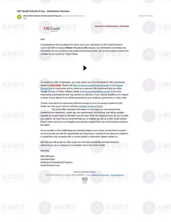 恭喜无忧留学学员L同学,本科就读于北京化工大学法学专业,凭借均分83.62的扎实学术表现,托福104的高分语言实力,深厚的法学专业积淀,突出的实践能力与清晰的职业规划,不仅成功突围激烈竞争,斩获南加州大学法学硕士录取,更一举斩获27500美元奖学金+1500美元住房补助,总计29000美元奖励!