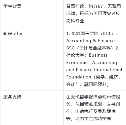 2025年英国本科申请季落幕,中国学生申请量再创新高。韩同学的案例给出了清晰答案,无雅思、均分87的普高生,凭借精准规划与专业服务,一举斩获伦敦国王学院(KCL)会计与金融本科(BSC)、杜伦大学商学经济会计金融国际预科双名校offer。本文结合无忧留学服务实践,复盘高考留学英国本科申请关键策略,为26fall申请者提供可落地的行动指南。