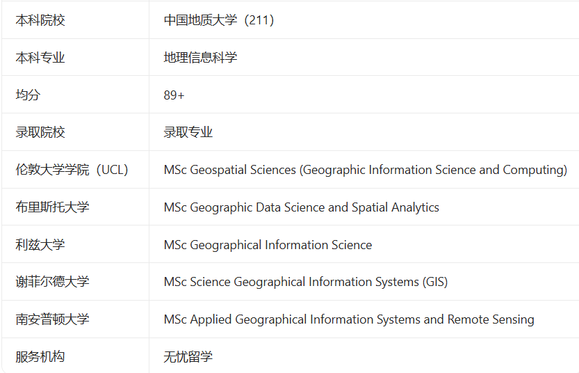 本科为中国地质大学地理信息科学,专业对口度拉满;均分89+,远超英国TOP 院校GIS专业2: 学位的基础要求;本科课程覆盖 GIS 原理、空间分析、遥感技术、Python编程等,学术基础扎实。25fall英国GIS申请人数同比增长超30%,UCL、布里斯托等院校该领域录取率不足15%;同背景申请者多集中于211/985 高校,均分88-90分段竞争激烈;GIS细分方向多元(数据科学、遥感、空间计算等),选错方向易导致申请扎堆或匹配度低。