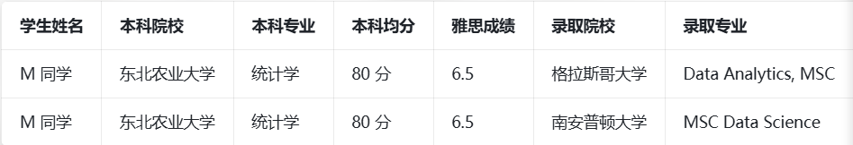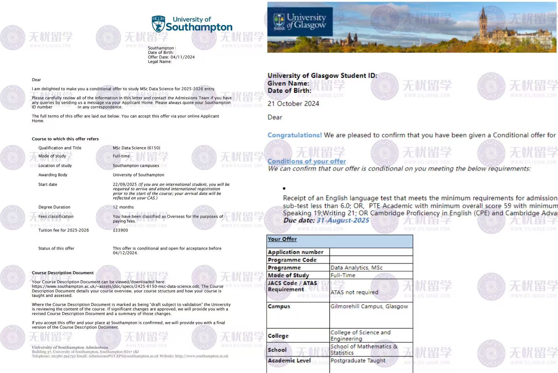 25fall英国硕士申请季落下帷幕,无数学子在offer的喜悦中开启人生新征程。其中,M同学的申请经历颇具参考意义,本科毕业于东北农业大学统计学专业,均分80分、雅思6.5,在无忧留学的全程精准规划与深度赋能下,成功斩获格拉斯哥大学Data Analytics(MSC)、南安普顿大学MSC Data Science两大顶尖院校热门专业offer,用实力印证了精准选题+专业服务的申请制胜之道。无忧留学始终以学生需求为核心,从选题定位、背景优化到文书创作、全流程跟进,用专业与细致破解申请难题,助力学子实现名校梦想,本文结合卢同学的申请案例,复盘25fall英国硕士申请选题的核心逻辑与无忧留学的服务优势。