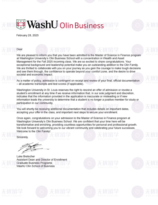 恭喜无忧留学学员Z同学,双非本科财务管理专业,凭借GPA3.34/4.0的稳定学术表现,雅思7.0的达标语言实力,GMAT705的高分标化成绩,以及扎实的财务管理专业积淀与清晰的金融深造规划,成功突围竞争激烈的顶尖金融硕士申请,斩获圣路易斯华盛顿大学Master of Science in Finance录取!